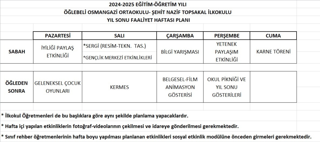 2024-2025 Eğitim-Öğretim Yılı son hafta etkinlikleri kapsamında okulumuzda yapılması planlanan etkinlikler aşağıda listelenmiştir.
